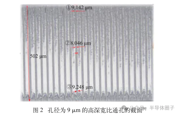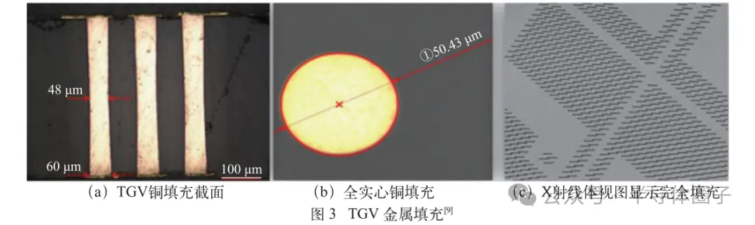玻璃基三维封装工艺流程始于紫外激光诱导改性刻蚀技术,通过飞秒脉冲激光在玻璃内部形成线性改性区域,改性区域的化学活性显著提升,在氢氟酸中的刻蚀速率较未改性区提高20~50倍,从而实现高深宽比通孔的高效加工,李文磊联合激光参数和腐蚀变量,开展激光诱导选择性刻蚀工艺研究,基于所设计的4因素和3水平正交试验表,制定综合评价指标,研究了各因素对TGV结构的影响显著度,运用该激光诱导刻蚀方法可以在100~700wm厚的玻璃上形成孔径为9~200m的通孔,同时确保通孔侧壁粗糙度低于1wm且无微裂纹缺陷,良率达99%以上,如图2所示。完成TGV通孔制备后,通过磁控溅射在通孔内壁连续沉积TiCu双层种子层,其中钛层作为黏附层,在提高金属膜层附着力的同时也可以抑制玻璃与铜的热失配应力,而铜层提供导电通路。接着采用蝶形电镀工艺从通孔2端同步填充铜金属,实现无空隙填实(空隙率<0.1%),电阻率低于2μΩ·cm,如图3所示。最终,通过光刻与电镀工艺在玻璃基板表面构建多层铜再布线层(RDL),实现水平信号延伸与跨层互联,得益于玻璃的低CTE与高尺寸稳定性,RDL对准误差可控制在±0.3μm以内,为高密度异质集成提供了可靠的互连平台。玻璃基三维封装使用TGV实现竖直方向上的信号连接,使用键合工艺实现不同芯片、基板的连接,水平方向则主要使用RDL工艺进行信号的延伸和互联。